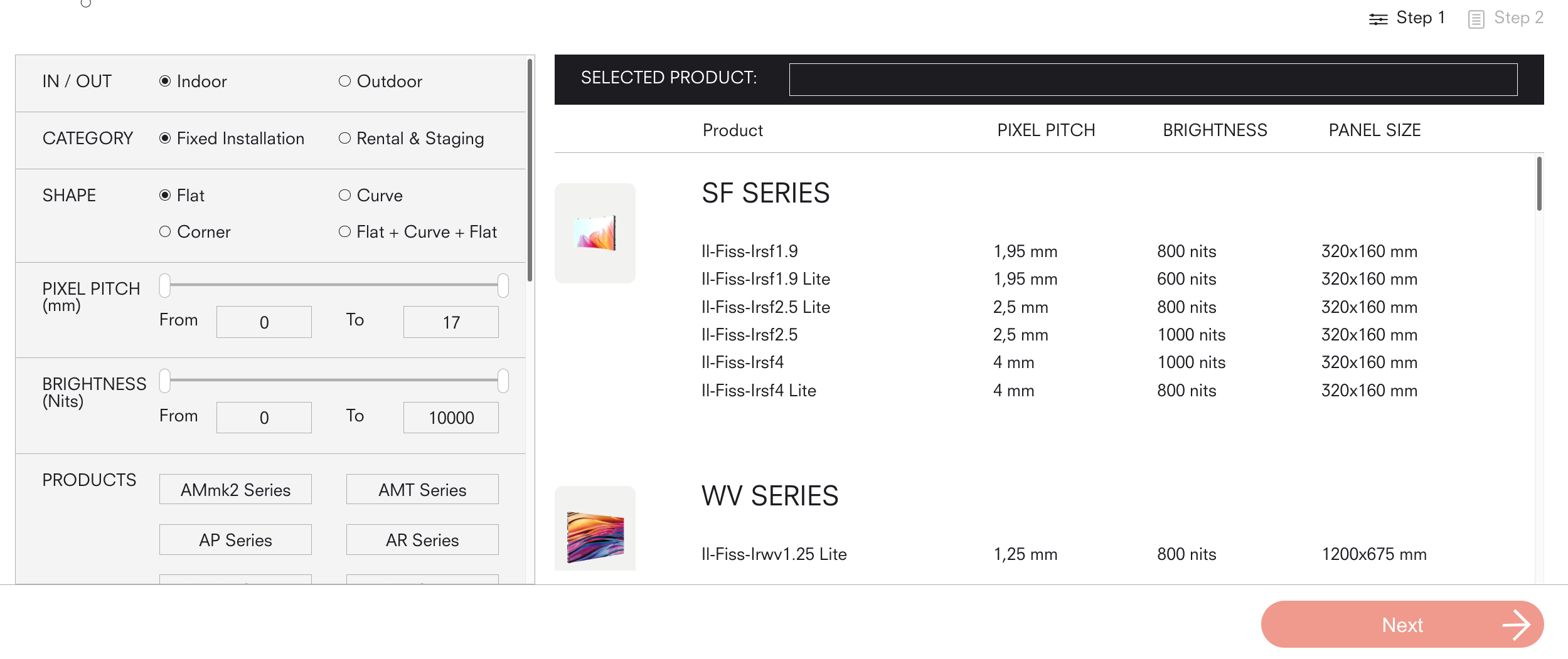 Our product configuration tool makes it easy to find the right product for your application. Simply adjust the specs below and we’ll shhow you the product ranges best suted for your needs. After that, enter the height and width of your video wall and we’ll tell you exactly how many panels and accessories you need to build it.